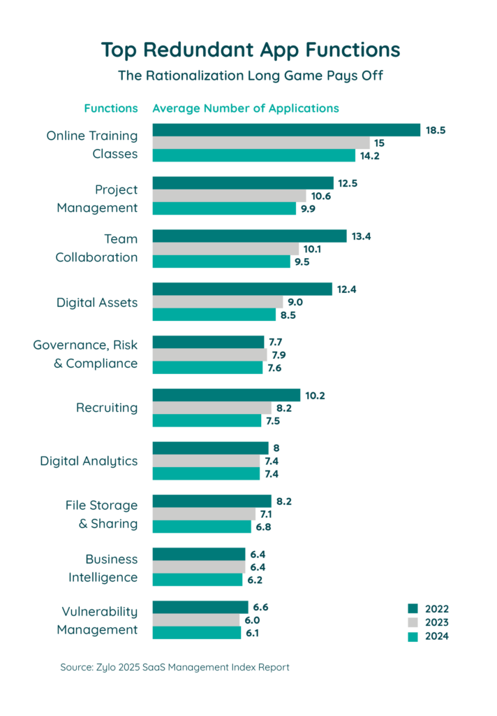 When separate teams adopt different apps for the same purpose, inefficiencies grow. According to the 2025 SaaS Management Index, redundancy is common. The top most redundant functions included: